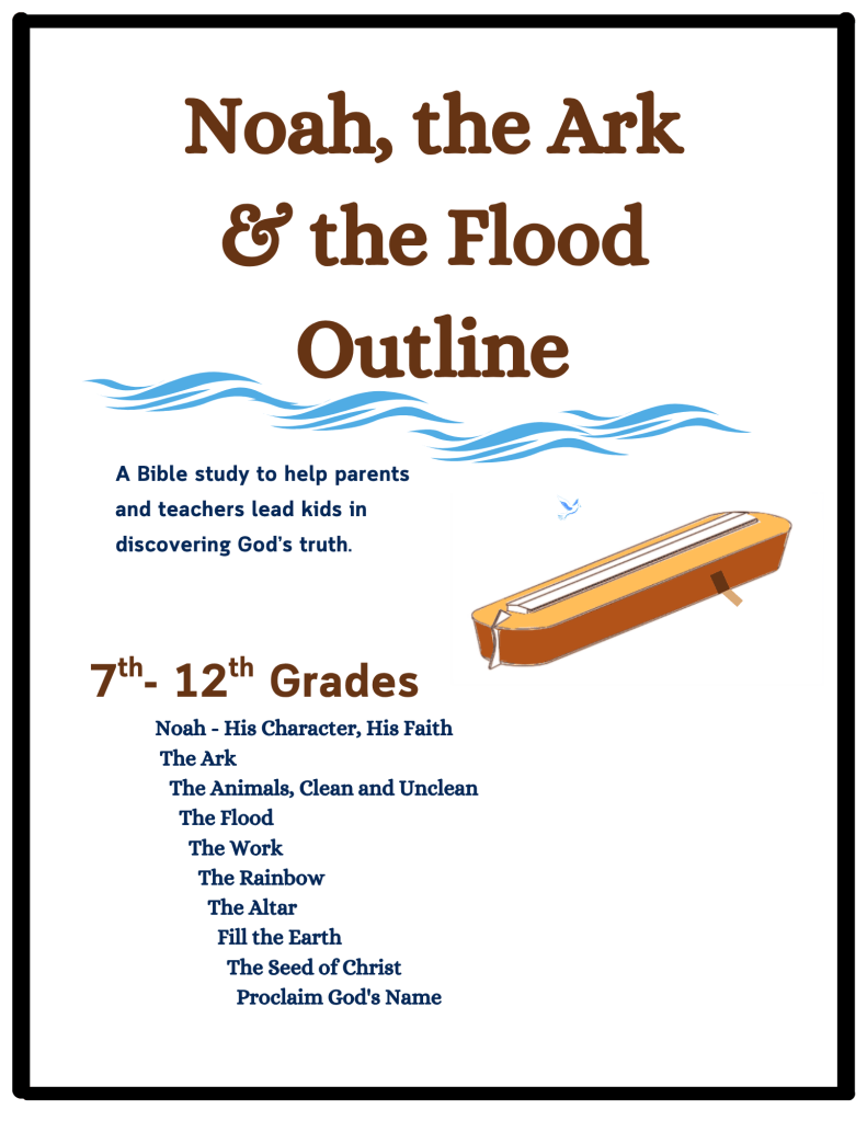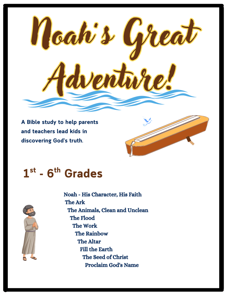 Noah’s Great Adventure 7th-12th grades helps parents and teachers lead children through Noah’s ark story and delves into God’s call and plan, Noah’s character, his faith and many other lessons: the ark, the animals, (clean & unclean), the flood, the work, the rainbow, the altar, subdue the earth, the seed of Christ and proclaiming God’s Word to all the world. This is an in-depth lengthy Bible study.